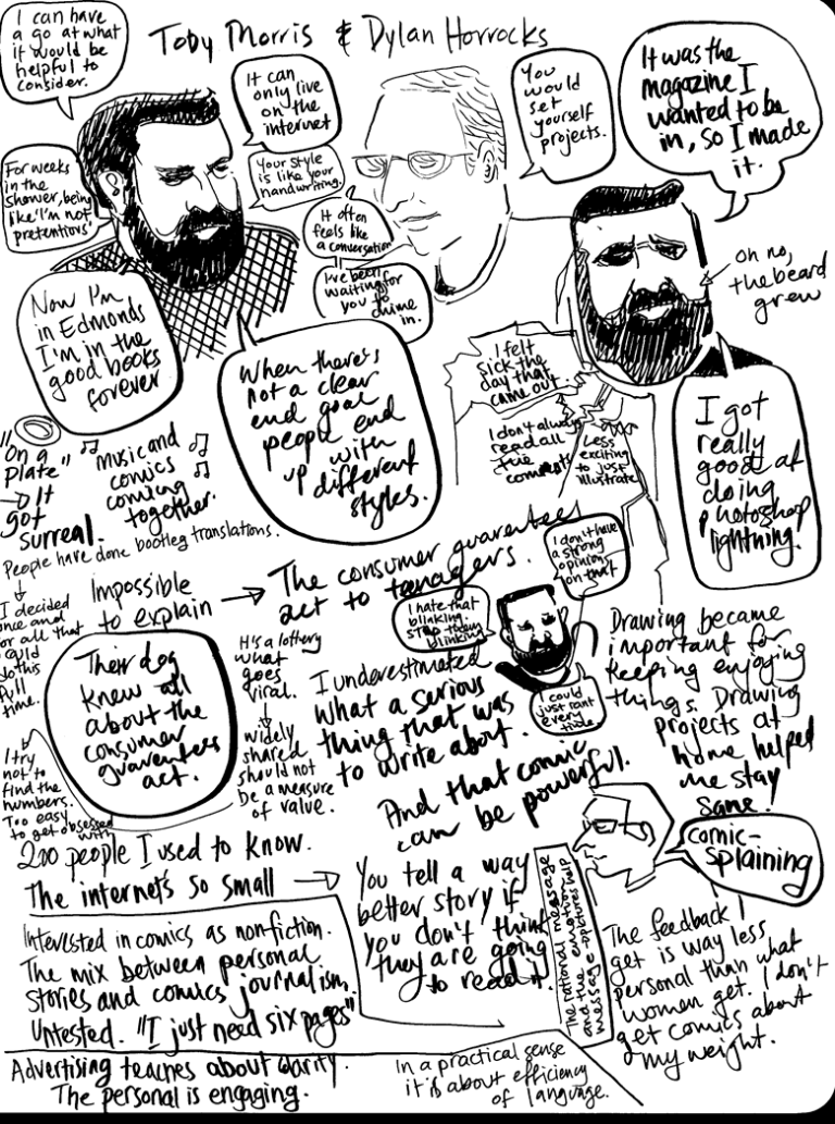 When I go to a talk, I usually try to draw the person presenting. I had a bit of a hard time today because the only way I could see Toby Morris was my craning my head so that it was parallel to the ground and leaning sideways on my chair. The light was such that both Dylan and Toby had black holes for eyes that I couldn’t quite make sense of and the angle that I first started drawing Dylan from, since he was the one I could clearly see, was not one he ever returned to. And then I made the mistake of trying to draw Photoshop lightning. That’s what the spidery mess under the second Toby is. There is a reason it is called “Photoshop” lightning. But perhaps I am making excuses.